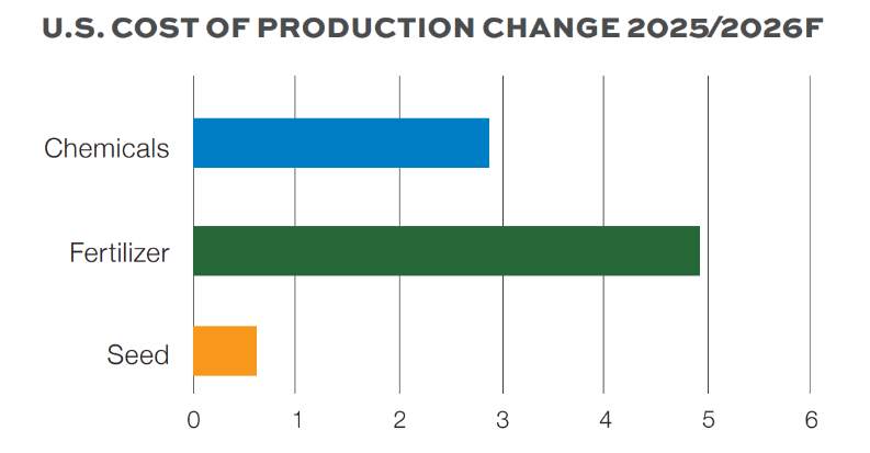 The figure below shows the USDA forecasts for increases in costs of production for agrochemicals, fertilizer, and seeds for U.S. growers in 2026, averaged across all key crops.