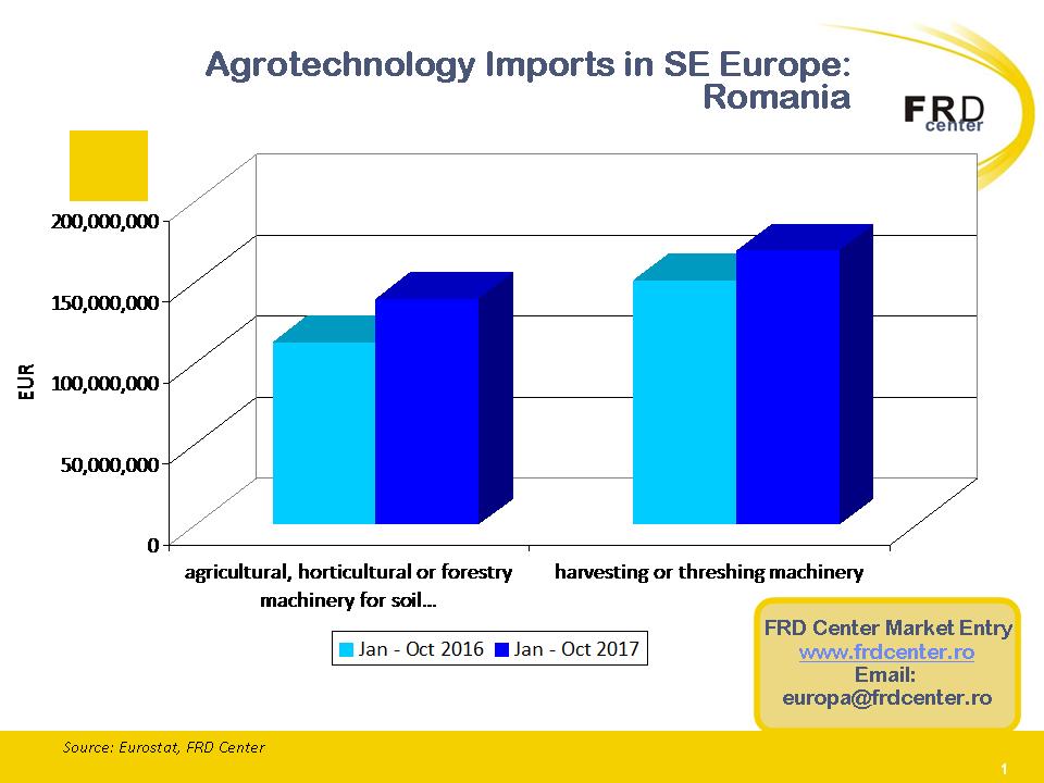 Rumania tiene una capacidad agrícola de aproximadamente 14,7 millones de hectáreas, de las cuales aproximadamente 10 millones se utilizan como tierra cultivable. El suelo es fértil y el clima propicio para la agricultura, la ganadería, el cultivo de hortalizas, la fruta y la horticultura.