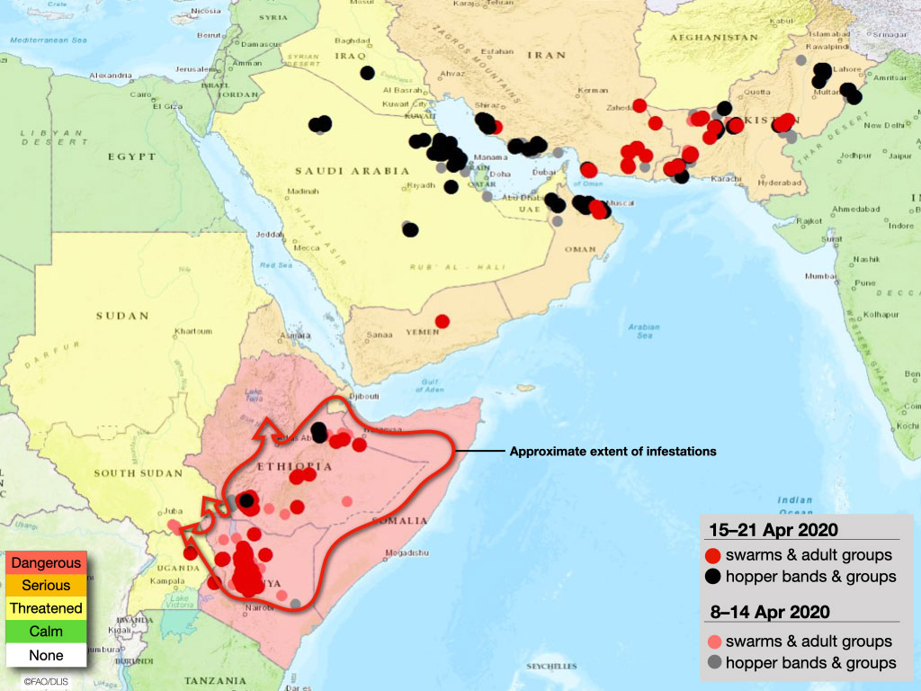 东非的沙漠蝗虫激增仍然“非常令人担忧”,因为更多的蝗群在肯尼亚北部和中部、埃塞俄比亚南部以及可能在索马里形成和成熟 更新 4 月 21 日,联合国粮食及农业组织。