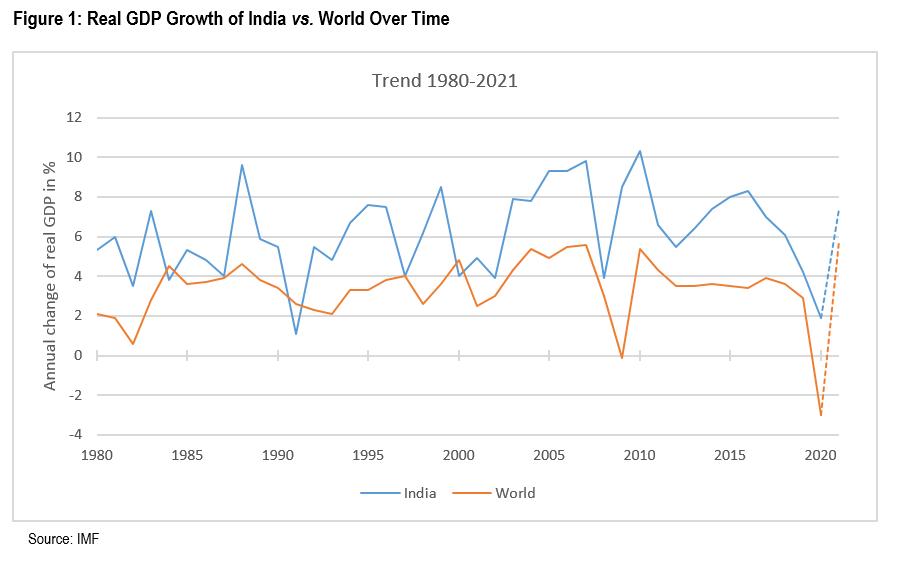 要为全球作物保护行业寻找第一个积极信息,只需看看印度。印度经常被报道为增长最快的“世界”经济体,甚至考虑到 COVID-19 对经济的重大影响,国际货币基金组织最新的可比较数据显示,自 2020 年以来,印度平均超过全球经济 3 GDP 年增长率的百分点(图1; 查看上面幻灯片中的所有图)。